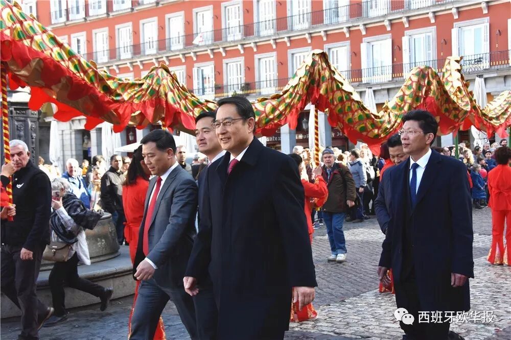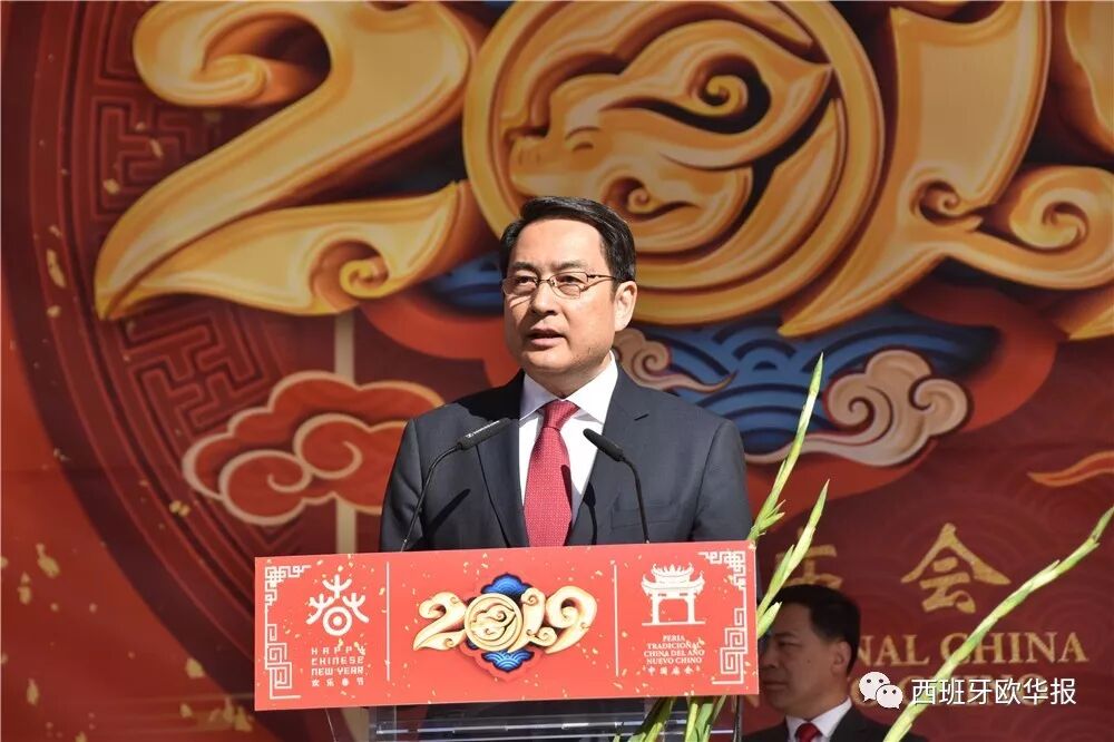 中国驻西大使吕凡先生在热烈的掌声中致辞。他表示:“热烈欢迎大家与我们相约于有400年历史的马德里马约尔广场,共庆2019年欢乐春节,参与中国庙会活动。今天,我们欢聚一堂,共同感受文化的碰撞与友谊的交融,我谨代表中国驻西使馆向马德里大区及马德里市政府的支持致以最衷心的感谢。尽管从中国农历来说,今天就是2019年中国春节的最后一天,但我相信中西两国间的友谊和合作将会继续蓬勃发展。”吕凡大使强调,中国驻西使馆将一如既往地关心广大侨胞在西班牙的生存和发展,继续做好各项工作,坚定维护旅西同胞的合法权益。最后,吕凡大使表达了对“四海同春”艺术团的感谢,并祝在场嘉宾新年快乐,诸事大吉!